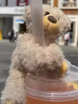 When you order a drink, it comes with a cute mini teddy bear figurine attached to the cup. This figurine isn't just a decoration; it's a keepsake you can take home! That's why many people are willing to wait in line to snap a picture.