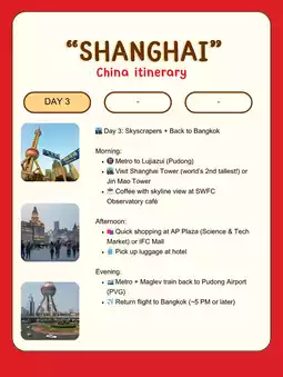 • 🏙️ Visit Shanghai Tower (world’s 2nd tallest!) or Jin Mao Tower