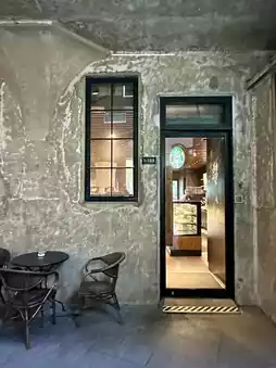 Concrete spiral staircases, art deco lines, shadowy corridors — and in the midst of it all, the warm aroma of espresso. Whether you’re sipping a latte by the window or taking a break between gallery visits, the space wraps you in a strange yet elegant stillness.