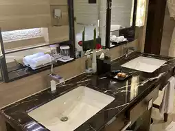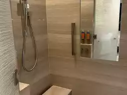 The bathroom has two sinks, so you can use them simultaneously without worry. The shower room has a chair, allowing you to sit and relax while showering.