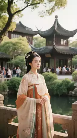 Wear Hanfu and hold a round fan, standing between the "slim and wrinkled" stone crevices