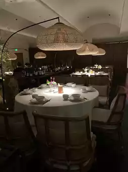 The entrance, adorned with stone blocks and a fireplace, exudes sophistication. Inside, the ambiance resembles a Western-style restaurant, with well-spaced tables that ensure a comfortable dining experience.