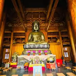 In the center of the hall is a statue of the Goddess of Mercy made out of camphor wood. Standing on a lotus-shaped base, it is 6.2 meters tall and weighs 5 metric tons