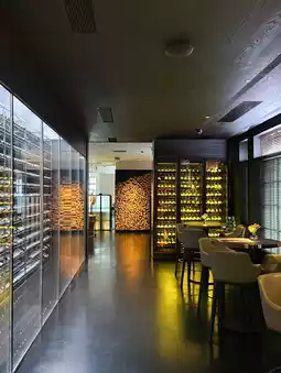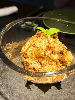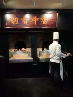 The signature dish, Peking Duck, was sliced by the chef right at your table. The crispy skin and juicy meat, paired with pancakes, were delicious. The Qianlong Emperor Cabbage Cold Roll, grilled abalone, French short rib consommé, and cheese-topped oysters were all luxurious and satisfying.