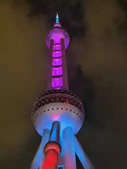 The Oriental Pearl Tower (东方明珠) is a towering television and radio tower in Lujiazui, Shanghai, China. Standing 468 meters tall, the Oriental Pearl Tower features 11 pearls and three columns, topped by three pearls of three sizes arranged vertically.[1] It houses nine television stations and ten radio stations. Inside the rotunda are restaurants, a 25-room luxury hotel, and shops. At its base, the tower houses the Shanghai Museum of Urban History, a futuristic simulation city, and a science and fantasy city. Upon completion, the Oriental Pearl Tower was the world's fourth-tallest tower and currently the fifth tallest. Anyone visiting Shanghai should definitely check in. It's incredibly beautiful and impressive.