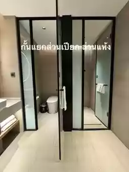📍 The shower door on the 3rd floor closes tightly, no water splashing out. On the 5th floor, if the shower is turned on at high speed, water splashes out, but it doesn't overflow. There's a bath towel to absorb it.