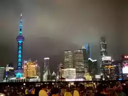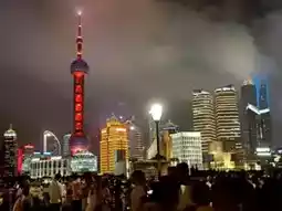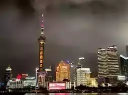 As night falls, the Oriental Pearl TV Tower gleams in dazzling lights. Its iridescent shimmers, a dazzling rainbow of colors, illuminating the modern cityscape along the Huangpu River. The shimmering waters of the river reflect the tower's shadow and the neon lights of the surrounding buildings, creating a bustling nightscape. As a landmark in Shanghai, the Oriental Pearl Tower integrates broadcasting, sightseeing, dining, entertainment, and historical displays, embodying the city's diverse and integrated character. At night, the Bund bustles with visitors, its streets and observation decks bustling with activity, showcasing Shanghai's unique charm.