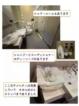 Amenities included a toothbrush, comb, cotton swabs, and disposable slippers. Two towels, one large and one small, were also provided, making it very comfortable.