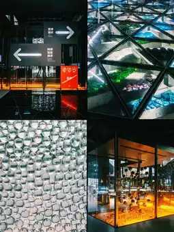 Through the kaleidoscopic glass tunnel at the entrance, five screens display slow-motion footage of visitors in motion, fostering a sense of connection and capturing the subtle link between the two. One particularly striking artwork consists of 10 large stained glass windows, each depicting a face from three different generations. Made from 900 pieces of glass in varying colors and textures, this artwork visualizes the close ties between generations while subtly hinting at the heritage preserved in this space. An interactive media installation called Fusion is located at the site of the original factory's glass-making kiln. It transforms visitors' movements into dynamic visualizations of materials and elements, allowing them to experience the three primary sensations involved in the glass formation process. This installation is a collaboration between the museum and media artist Tobias Gremmler, whose work explores motion in computer art. At the center of the main hall, eight LED animation lines shoot up from the ground, illustrating the history of glass manufacturing in Shanghai, as if they were remnants of heat emanating from the kilns of the past.