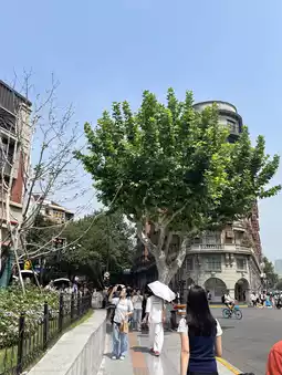 🍃 The surrounding atmosphere is filled with romance and tranquility, despite its central location. The surrounding streets are lined with large, shaded trees, making it perfect for strolling or finding beautiful photo opportunities. The building features French Renaissance lines, including arched doors, tall windows, balconies on the upper floors, and an arcade on the lower floors. All elements allow for multiple angles for photos, whether from across Huaihai Road or where Wukang Road meets, creating beautiful perspectives.