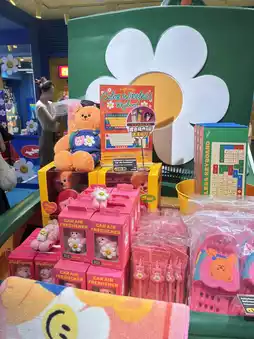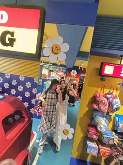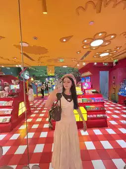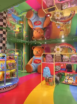 As soon as you step inside, you'll be greeted by bright and colorful décor. The main colors are red, yellow, green, and blue, along with neon lights and unique decorations such as large teddy bears and adorable toys. The store offers various photo zones, including popular spots like the spiral staircase and the colorful walls, perfect for capturing stunning photos.