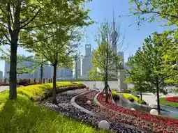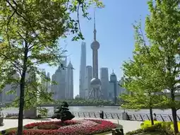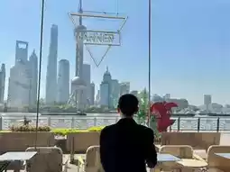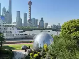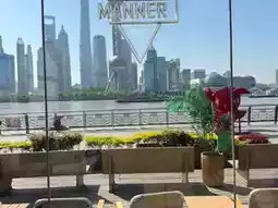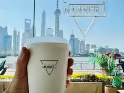 Cross the street to the opposite side to take a photo. 🥚 *The oval corner with the Oriental Pearl Tower in the background. Then, walk to the right and follow the waterfront. You'll see Manner Coffee (North Bund). Sip coffee with a view of the Oriental Pearl Tower. ☕️🌿