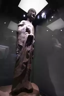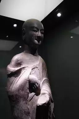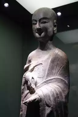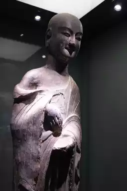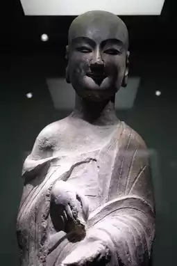Originating from Cave 102 of the Maijishan Grottoes, this disciple statue features a handsome face, long neck, rounded shoulders, a symmetrical round face, slightly squinting eyes, long and clear eyebrows, a smiling mouth corner, gentle and reserved expression, embodying the Western Wei Buddhist sculpture’s artistic pursuit of secularization and humanization.