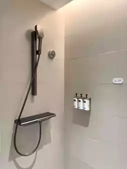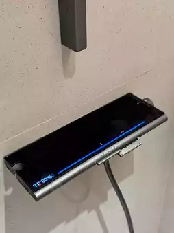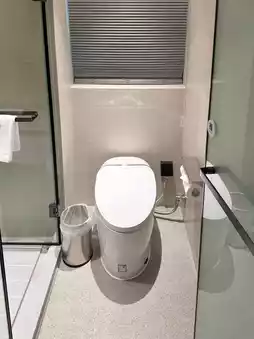The bathroom is well-equipped. The water temperature adjustment system has a screen to set the exact temperature, and the toilet flush is operated by a foot sensor instead of a button.