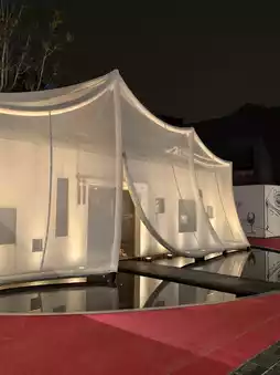 Further inside is the perfect clash of vintage and modern architecture: old stone walls paired with gilded arches, warm lighting elevates the luxury feel; the off-white small building’s arched wooden windows give a relaxed vibe, and the lights under the trees are as soft as if coated with sugar frosting 🍬