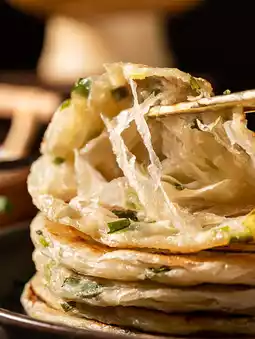 Scallion pancakes, or roti dough mixed with scallions, are deep-fried until golden brown. This popular Shanghai street snack is best enjoyed while hot to experience the crispy exterior and soft interior that captivates locals.