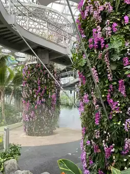 Next, hit up the Cloud Corridor and BAM—you’re surrounded by flower power! Huge flower columns loaded with Phalaenopsis orchids stretch high above, with misty palms 🌴 below setting the vibe. Sneak around the “seating” and you’ll catch stunning butterfly specimens 🦋—fun surprise for all you curious explorers!