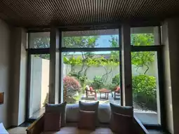 - Floor-to-ceiling window restaurant with pool views while dining