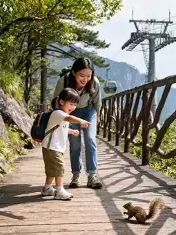 Take the Zhong’an cableway up the mountain with kids over 3 years old (one way 65 RMB). After the cableway, walk the Fuxing Valley wooden plank road where squirrels appear along the way. At the Hanging Horse Stake plank road, the kid ran 2 kilometers by himself and counted all 1,188 steps to earn a chilled watermelon 🍉