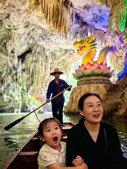 Ride a small boat through the "Dragon Gate," where stalactites under colored lights turn into dragons and lotus thrones. The boatman suddenly speeds up for a surprise, and the kid held my arm tightly, so cute!