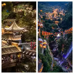 🌉 A red bridge spans the emerald waters, with rafting boats gliding underneath. Lush green mountains and trees line both sides, making every snapshot a picturesque masterpiece. A high-hanging suspension bridge adorned with red lanterns🏮 gives the sensation of walking on clouds. From above, you can overlook the valley streams and distant villages, fully embracing the wuxia vibe!