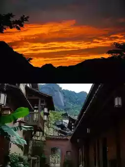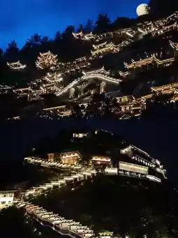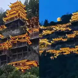 A hundred-meter waterfall cascades from the cliff top, roaring as it falls into a deep pool, with mist spreading like a fairy’s breath. The cliffside guesthouses are built against the steep rock face; opening the wooden window reveals a sea of clouds rolling by, as if a crane carrying a book might arrive at any moment. When dusk falls, the entire valley gradually lights up, with corridors, bridges, and pavilions emerging in the light and shadow, like a celestial night market quietly descending to the mortal world.