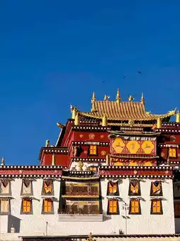 🏯 The monastery's vibrant red and yellow hues, combined with its shimmering golden roof against the clear blue sky, create a stunning visual treat.