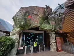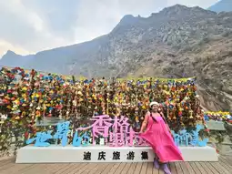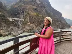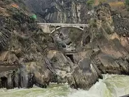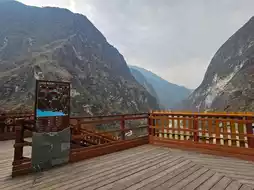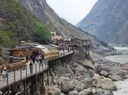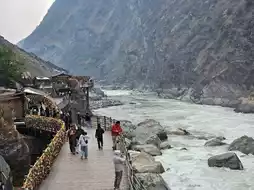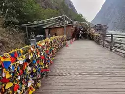 Visitors need to purchase tickets before entering. From the parking lot, there are approximately 3-4 escalator sections leading down to the riverside. Along the way, there are several scenic viewpoints to enjoy. At the bottom, a walkway runs along the river to the narrowest point, where legend has it that a tiger once leaped across, giving the gorge its name. At the end of the path, there is a viewpoint and a statue of a tiger looking back, which serves as a photo spot. Nearby, there are shops selling plaques for visitors to write their wishes and hang them up. The area is adorned with numerous hanging plaques, offering another picturesque photo opportunity.