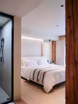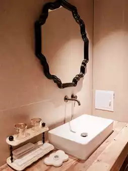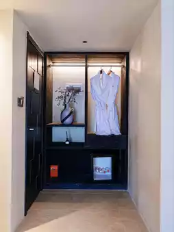 The boutique hotel combines elegant modern style with refined wabi-sabi elements, along with amenities like elevators, a gym, and meeting rooms, enriching the stay experience.