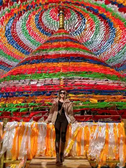 The prayer flags are arranged high up, a vast expanse of colorful fabric fluttering in the wind across the mountain, creating a breathtaking scene. It's about a 5-minute walk from the Moonlight City Tunnel. The best time to visit is in the morning or afternoon, when the colors are at their most beautiful under the sun and the sky is incredibly blue.