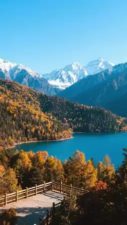 Bitahai Scenic Platform view: autumn forests ablaze with color, distant snow-capped mountains majestic, perfect for wallpaper-worthy photos.