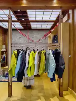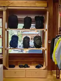 👉The environment is so, so, so comfortable! Compared to the crowded big store in Japan full of tourists, this place is simply quiet and elegant! Basically, only hotel guests come to shop here~ The light in the store shines through large floor-to-ceiling windows, and the shelves are neatly arranged with outdoor backpacks. The black and blue styles look especially textured on the wooden display racks, and you can also see green plants outside the window 🌿