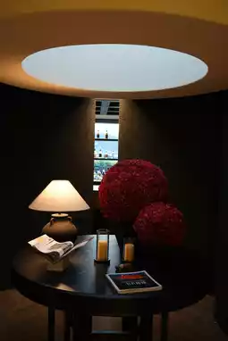 △ Rooftop terrace offers views of the prayer wheel at night