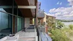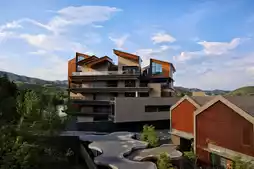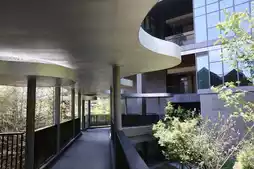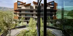 5. The architectural design draws inspiration from Hakka sloping roofs, reinterpreted through contemporary language. The bold facades harmonize with warm wood, while lush greenery adds layers, creating an organic vitality and unique charm. Viewed from the lake, the buildings' overlapping sloped roofs interplay with light and shadow, reshaping the endless mountain range into something renewed.
