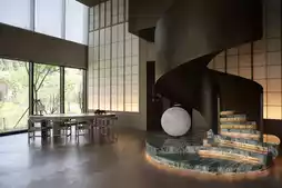 6. The hotel deconstructs and reconstructs spatial functions, distributing guest rooms, restaurants, and leisure facilities across three main buildings: "Serendipity," "Bamboo Dye," and "Moon Embrace." Covered walkways link the buildings, their curved roofs flowing softly like clouds or pathways through time, connecting endless beauty.