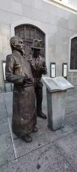 In front of the building, there are several bronze statues depicting a street vendor selling grass jelly, a Western female student, a Chinese man in a traditional long gown and mandarin jacket, and a Westerner in a suit, showcasing the fusion of Chinese and Western cultures.