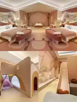 The water park, a must-visit for kids in summer, is now officially open! The hotel also features themed family rooms with slides, private hot spring pools, and more!