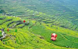 First, the sea of rapeseed flowers. From the 861.3-meter summit of Fuchi Mountain, you can overlook the entire terraced "sea of rapeseed flowers." The view is breathtaking, presenting a "sea of gold" that uplifts your spirits. You can easily capture stunning photos of the rapeseed flowers!