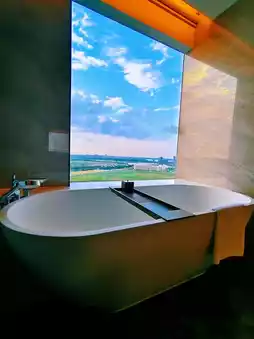 🚿Bathroom: Instant hot water! A built-in seat by the wall makes showering convenient. But the highlight is the window-side soaking tub – imagine unwinding with a glass of wine, fresh pastries, and a bubble bath while enjoying riverside breezes. Pure bliss after a long day.