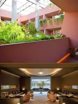 Rooms feature green-planted sun terraces or geometric street views, blending with nature-inspired interiors to create a comfortable sleep experience.