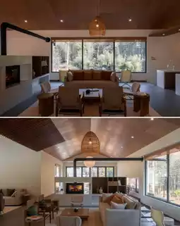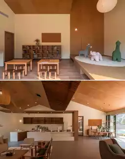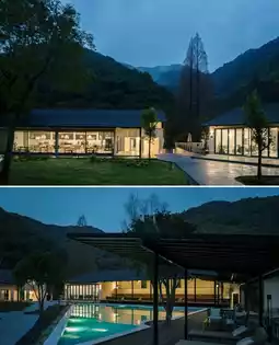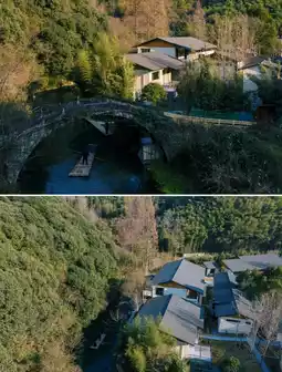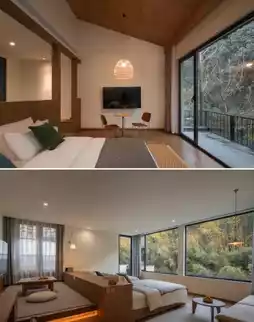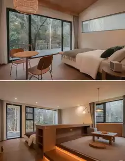 The homestay consists of three buildings, originally transformed from local farmhouses, maximizing the preservation of the original terrain and vegetation. The buildings are staggered in the valley, naturally borrowing the scenery: floor-to-ceiling windows embrace the stream and bamboo sea, furniture in natural wood tones paired with straw mats and curtains. Every corner reveals the designer’s interpretation of "light seclusion." The courtyard retains old persimmon trees and wild grass slopes, complemented by stone steps, pottery jars, and bamboo fences, exuding a handmade texture and the wild charm of seasonal changes.