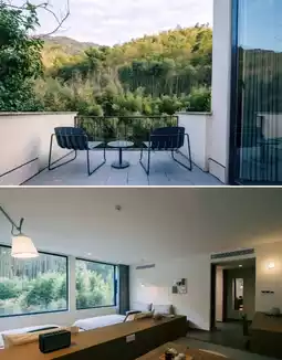 The entire property has only 20 rooms, distributed across three waterfront buildings, each with floor-to-ceiling windows plus a private terrace/balcony. Open the window to see the stream and bamboo sea. Rooms are equipped with floor heating and air conditioning, Muji-style furniture, custom mattresses, high-thread-count cotton-linen bedding, Marshall speakers, custom tea sets, and bath products made from natural plant-based brands. The hardware matches five-star standards.