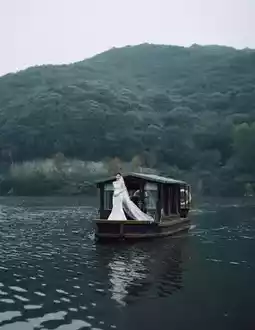 She takes a small boat, slowly sailing towards him waiting on the other shore, holding hands and gazing at each other, the lake reflecting their vows.