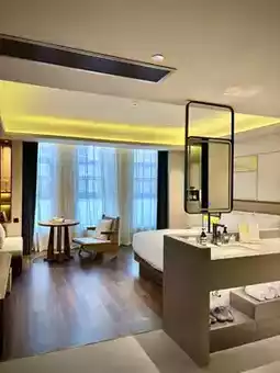 The room is equipped with a voice-activated smart control system, allowing for easy control of lighting, electric curtains, and air conditioning. The bathroom, with separate wet and dry areas, is equipped with a smart toilet. The bed is soft, with a choice of memory foam and duck down pillows. Double-layered soundproof glass blocks out external noise, ensuring a good night's sleep. The mini bar also offers free drinks, a truly heartwarming touch. ☺️