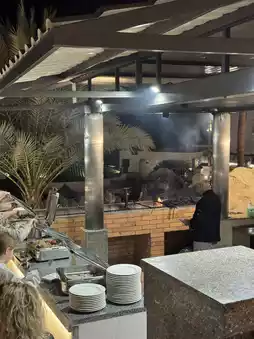 Inside the resort, however, the evening buffet area offers a completely different atmosphere. Laughter fills the air, the cheerful clinking of utensils resonates, and the aroma of delicious food permeates the space. A lively and dynamic evening celebration begins. 🧆🥗🍷