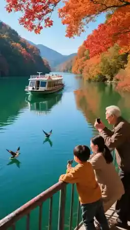 - Scene: Emerald river water, red leaves reflected on both banks, fishermen casting nets like Song Dynasty paintings