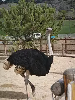The asphalt road glistens with moisture in the morning mist, winding like an ink-colored silk ribbon into the depths of mountain shadows. Red rooftops peek out from behind gray-green fences, their eaves still hanging with gauzy curtains, like eyelids heavy with sleep. I count the yellow lines as I stroll forward, suddenly hearing a soft rustling—an ostrich on the sandy ground preening its feathers, its snow-white neck curved into an elegant question mark, its tail feathers filtering fine gold flakes through the pine shadows.