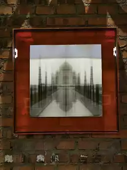 The Taj Mahal on the brick wall awakens in the twilight. The weathered red frame cannot contain its reflection in water; those marble arcs grow sharper in the black and white world, slicing dusk into intertwined ribbons of light and shadow. I reach out to touch the coolness seeping from the brick joints but catch a falling silk tree blossom instead—so the deep courtyard hides May's snow, orange-red fruits nestled among white petals, gently swaying before the carved windows of the cream-colored building.