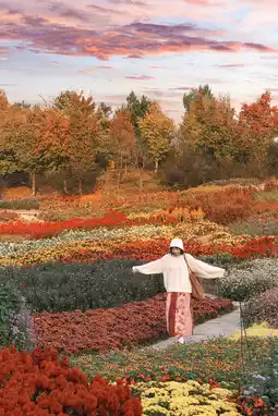Stepping into the chrysanthemum exhibition at Shenyang Expo Garden is like falling into a sea of colorful flowers. Millions of chrysanthemums line the paths, with petals in layers of golden yellow, pink, and dark purple, some spreading like butterfly wings, others curling like pom-poms. In the Chinese-style chrysanthemum garden, white chrysanthemums paired with black-tiled flower windows invite you to stroll in a light apricot qipao. Gently touching the petals, the red walls and blooming flowers reflect on the flowing fabric, and every snapshot is a classical and elegant autumn masterpiece. Beside the European-style flower beds, sulfur cosmos and Persian cosmos intertwine. Wearing a denim jacket with a floral dress, running and capturing the moment petals fall, the scene is full of vibrant autumn energy. On sunny days, afternoon sunlight bathes the flower fields, gilding each chrysanthemum with a golden edge. Standing under the flower trellis with a gentle smile, the interplay of light and color makes every frame as bright as an oil painting.
