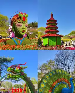We strolled slowly along the park’s paths, stopping now and then to admire the flower sea, then drawn to the unique buildings over there. When tired, we sat on benches by the roadside to rest, watching the happy smiles on passing visitors’ faces and listening to occasional laughter nearby, feeling completely content. Unconsciously, dusk gradually fell, and we reluctantly prepared to leave. Walking toward the park exit, we couldn’t help but look back repeatedly, wanting to take in the poetic beauty a few more times and deeply imprint it in our memories.